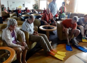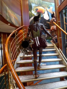Performers boarded the Orion in our last island port and drummed a farewell before we sailed to the Great Barrier Reef. The last days at sea were rough, literally and figuratively. Barf bags were tucked behind the rail on every deck. The ship’s doctor Doctor Chris administered shots and big blue nausea pills; Dramamine was heaped in a tasteful bowl on the reception counter.