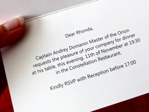 Each day at sea there were workshops and lectures on the flora and fauna of PNG, space travel, photography, and a cultural briefing on the islands we would visit—all accompanied with drinks and traypass hors d’oevres. The food—three squares a day plus high tea and assorted cocktail parties—was exquisitely prepared and, like most cruises, nonstop. I was giddy like a girl asked to the prom when a note addressed to Miss Coleman in Stateroom 310 included an invitation to dine that night at the table of Captain Andrey Domanin, “Master of the Orion”.