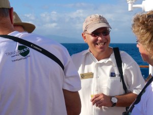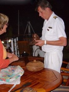 Each day at sea there were workshops and lectures on the flora and fauna of PNG, space travel, photography, and a cultural briefing on the islands we would visit—all accompanied with drinks and traypass hors d’oevres. The food—three squares a day plus high tea and assorted cocktail parties—was exquisitely prepared and, like most cruises, nonstop. I was giddy like a girl asked to the prom when a note addressed to Miss Coleman in Stateroom 310 included an invitation to dine that night at the table of Captain Andrey Domanin, “Master of the Orion”.