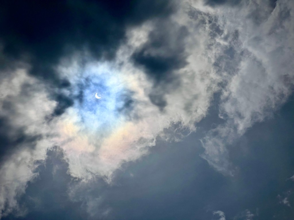 At 1:00pm—35 or so minutes until totality—the partial phase is at the halfway mark. Clouds quickly come and go.