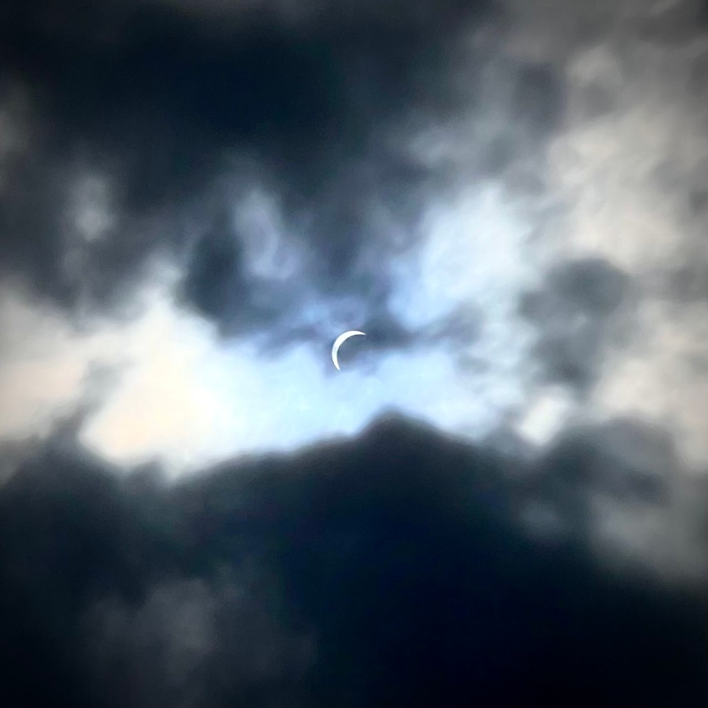 No drones were allowed earlier, but now two are flying high in the air, trying for an unobscured shot. Someone nearby has a helpful spoken phenomena coach on speaker: “Diamond ring in one second…remove eclipse glasses now!” The diamond ring struggles to be seen as a thick grey cloud engulfs the sun; everyone makes the “whoah…uuhhhhh…OOOHHHH…ARRRRG!” sound as the shocking totality—just a peek—is visible. Then she’s gone.