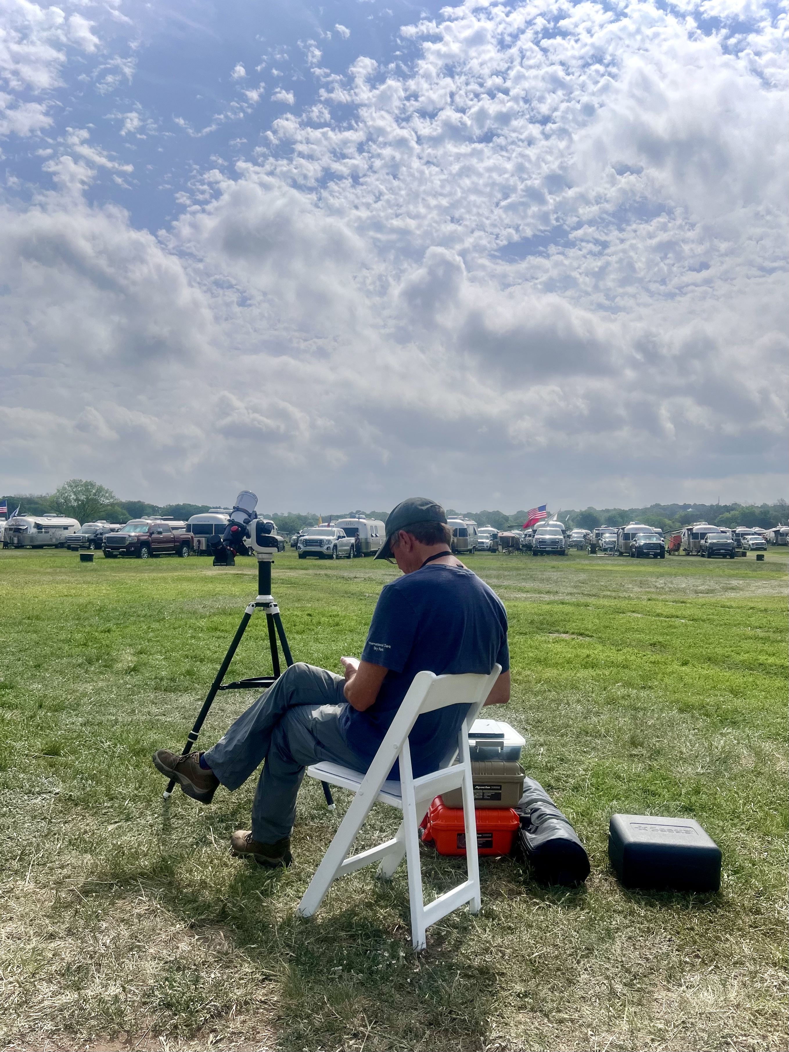 By 10:00am, clouds have rolled in again. And then they’re gone. And then they’re back. By noon no one is talking about it, like a no-hitter is underway. The moon takes a little bite of the sun, right on time, at 12:18pm. First contact; TSE2024 has begun.