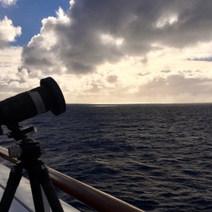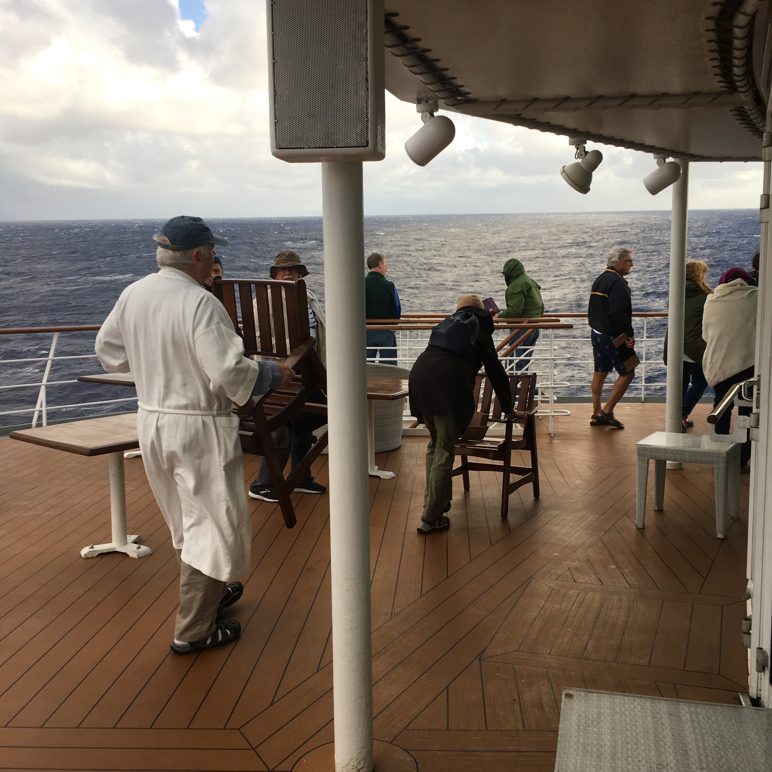 Others, wrapped in blankets, settled in chairs on both sides of deck 8. Deck 9 and the foredeck of 8 were roped off for users of sensitive cameras and telescopes. It was windy and the sea pitched the ship a bit, creating a real rodeo for the ‘scope folks on the upper decks.