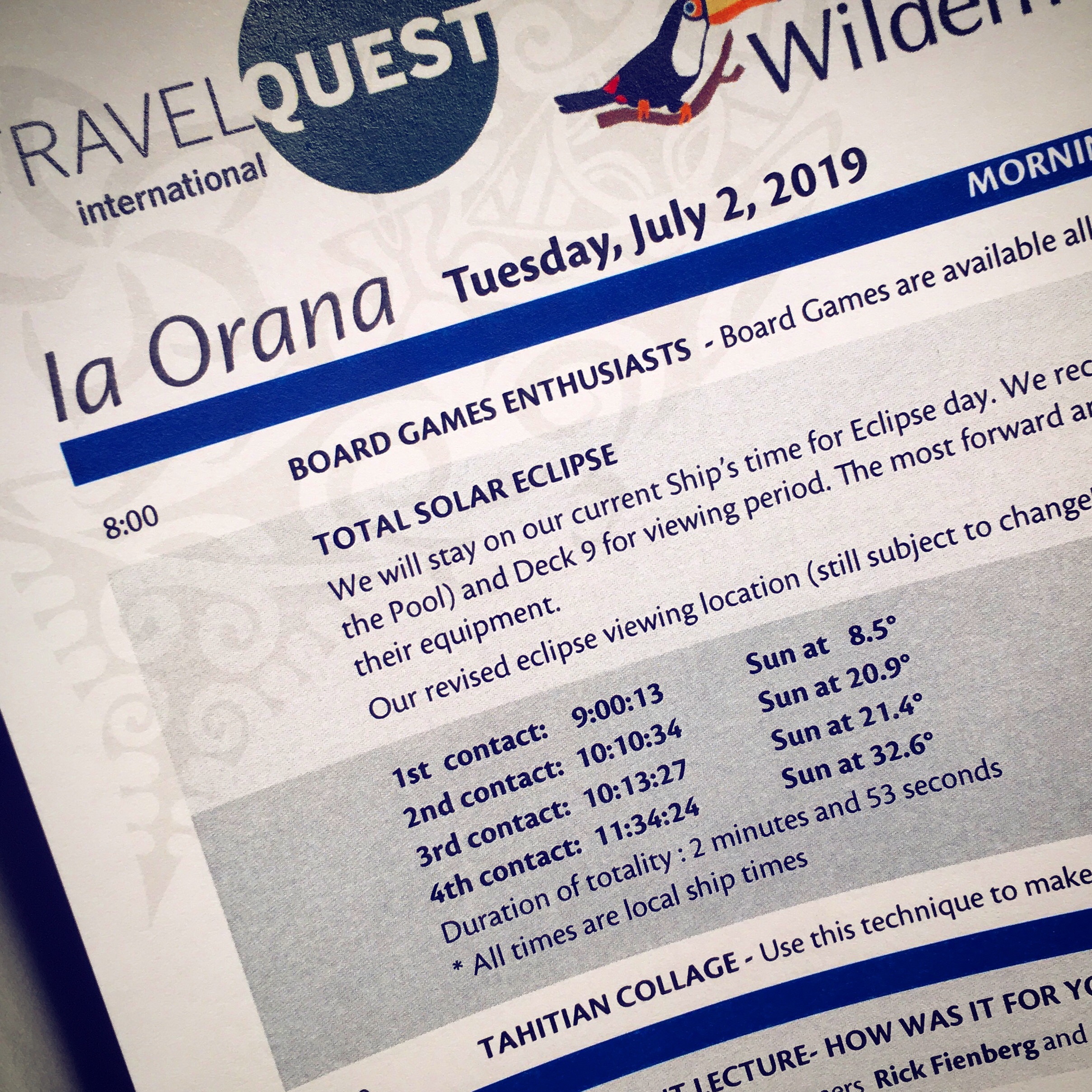 Feinberg continued his dignified phenomenon announcements (“this is when you should be able to see shadowbands”, etc.) from his position on the bridge with the captain. Both furiously calculated possibilities, and the Paul Gauguin was turned and turned and repositioned again and again and again to try to find a hole in the dark grey clouds, to no avail. We were skunked.