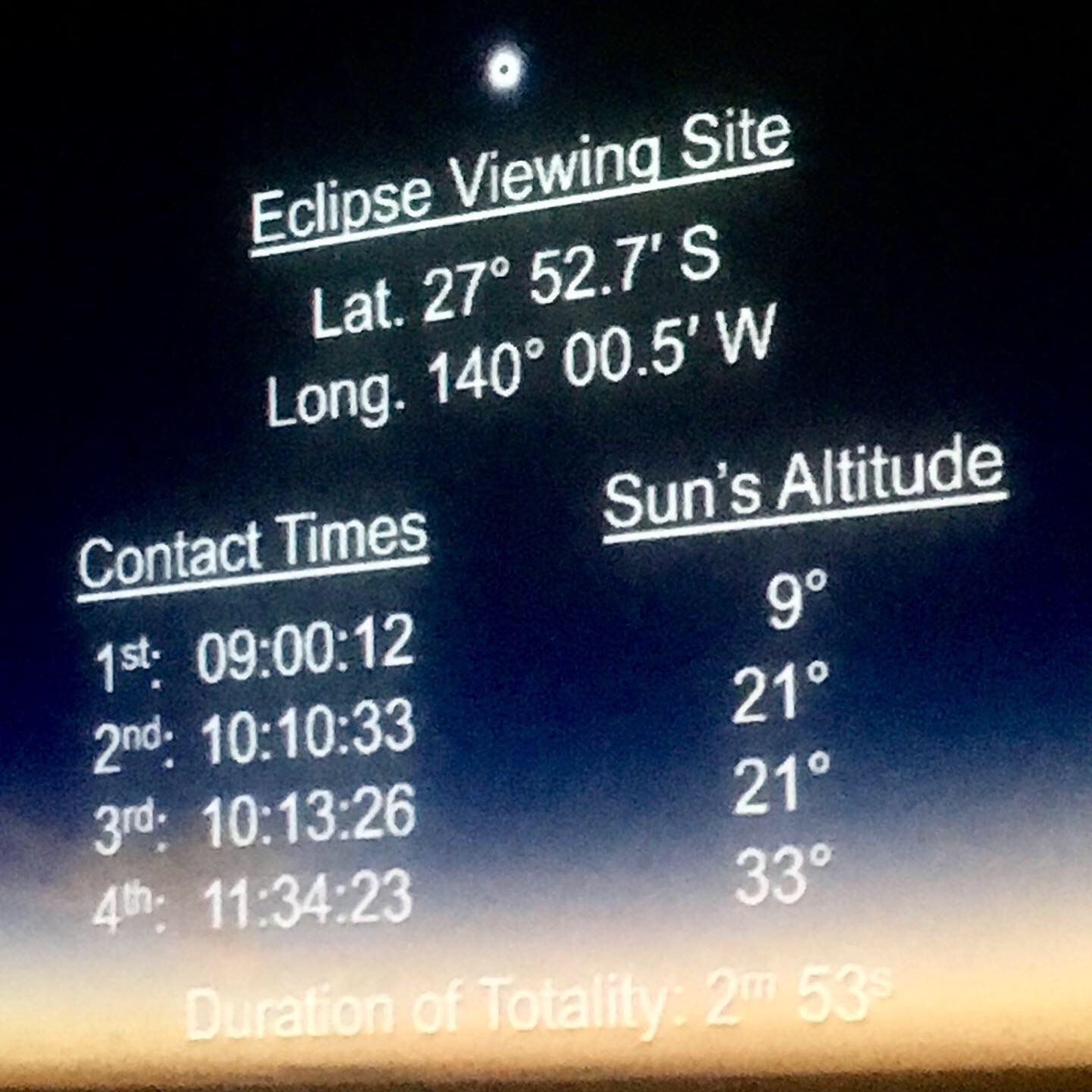 Eclipse Day: Tuesday July 2, 2019. We arrived at the revised viewing location—27 degrees 52.7’S 140 degrees 00.5’W.