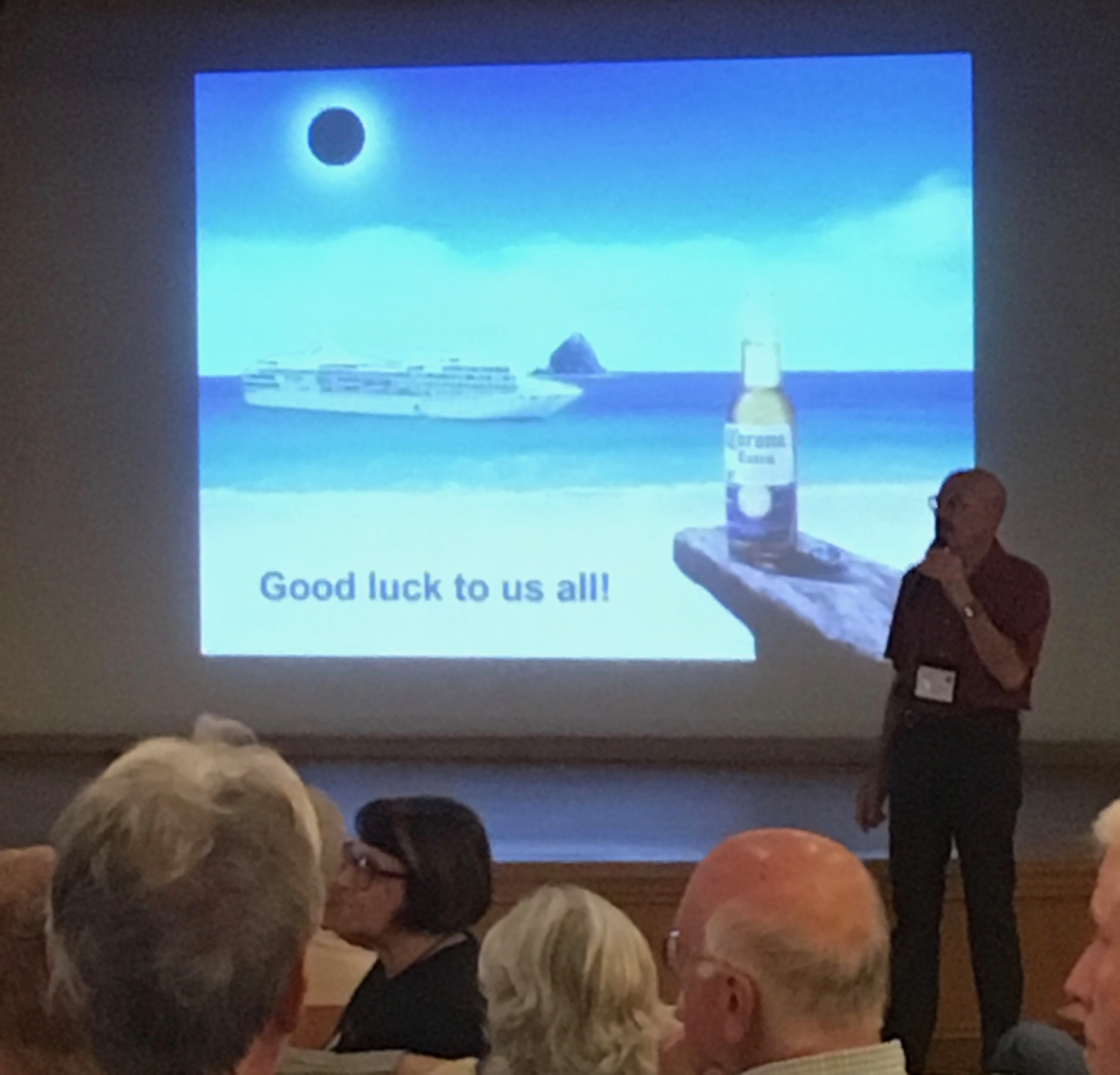 By 7am most had staked out their viewing site, and were excited and optimistic. Nearly three minutes of totality were in store. I chose to view from the bar, La Pallette on deck 8, where mimosas were being served and there were tables outside where I could make my astronomical drawings after first contact.