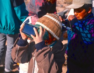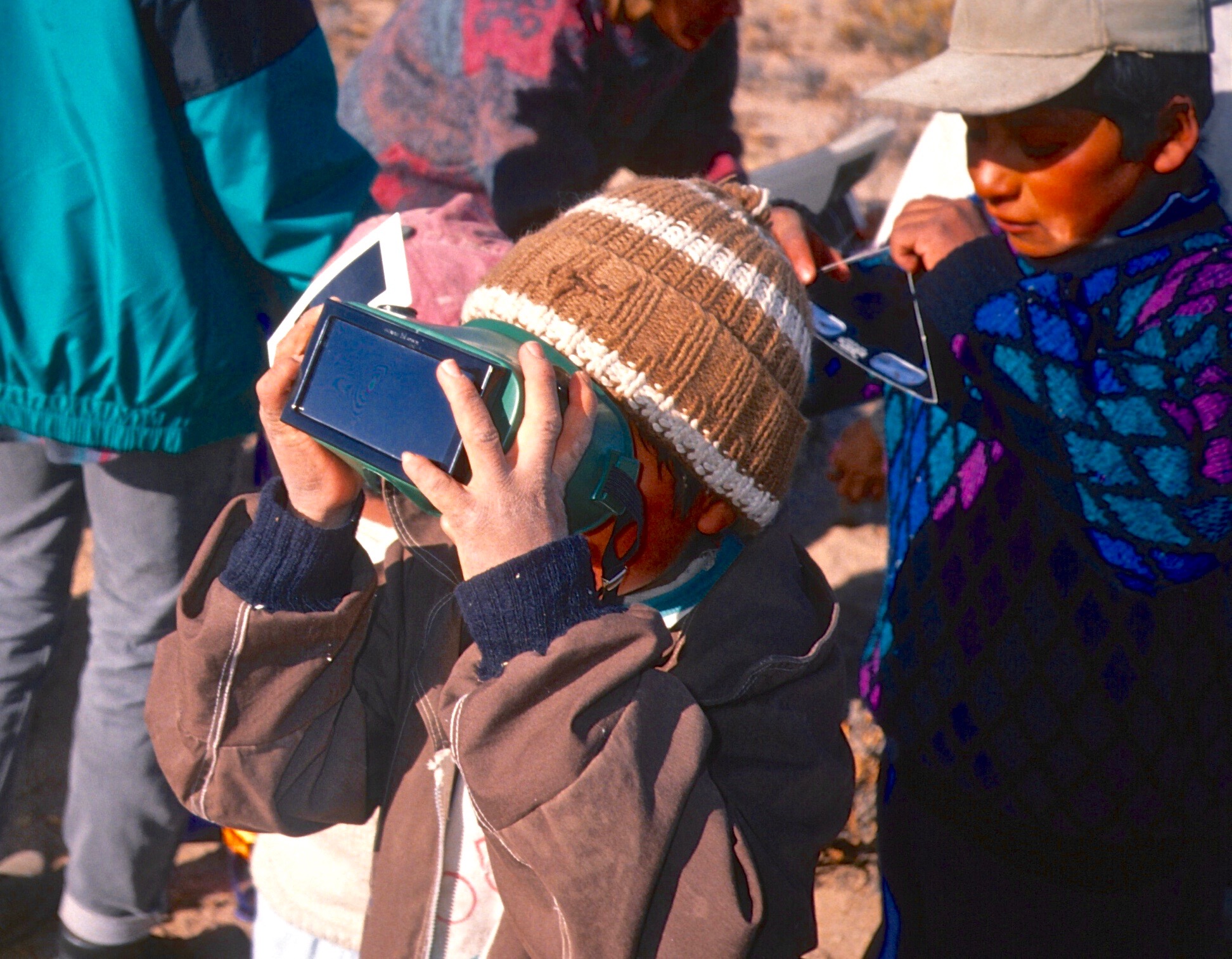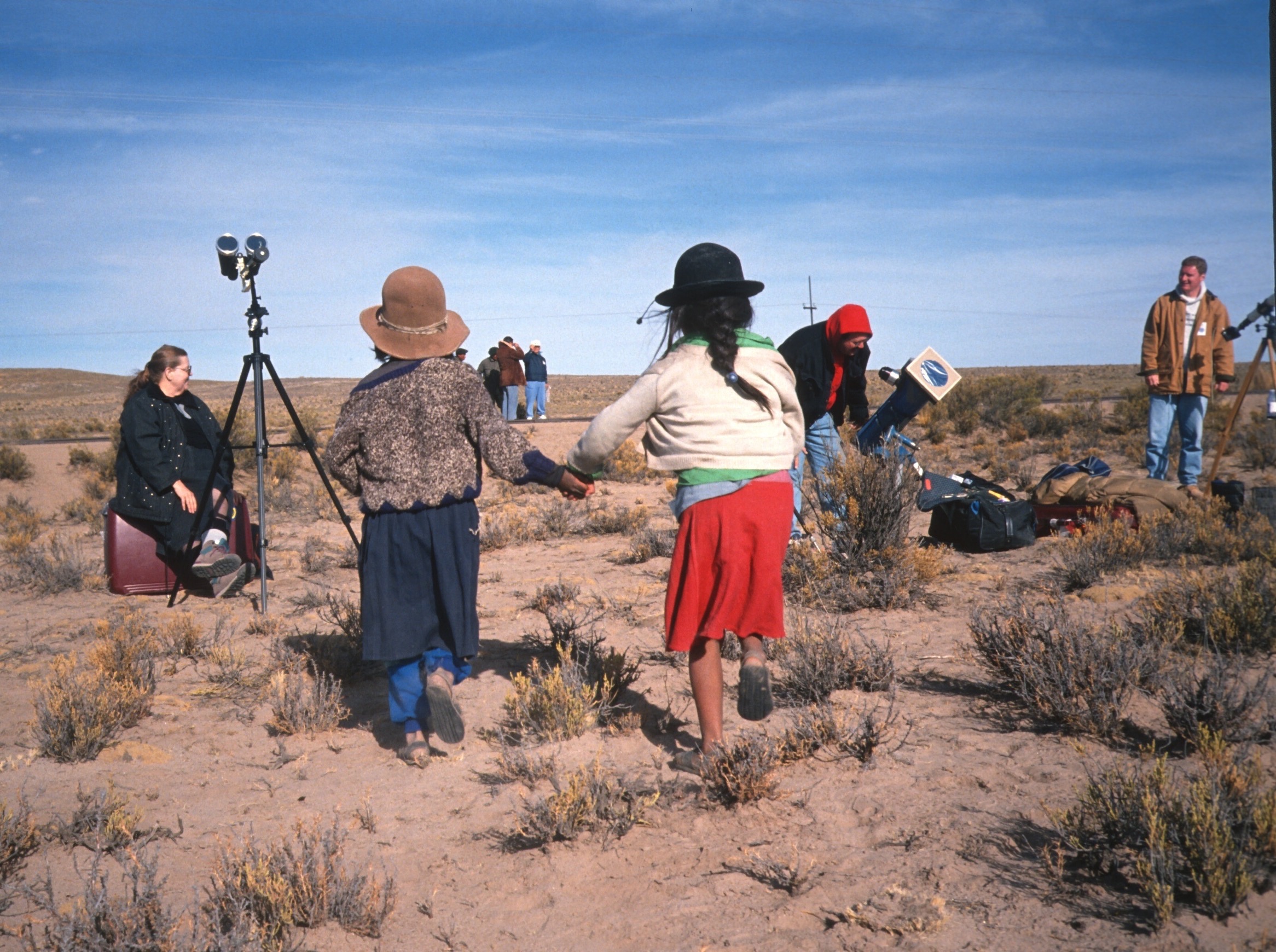 I was excited to be observing at a high-altitude site—about as far from my sea level first eclipse as possible—where the coronal streamers were expected to be long and bright (as light from the corona wouldn’t be dulled by Earth’s atmosphere). The air was thin and the wind was chilly. Local children, families, and military guards armed with machine guns materialized to view partiality through our solar scopes and eclipse glasses. I later learned that only 600 souls were present on the Altiplano.